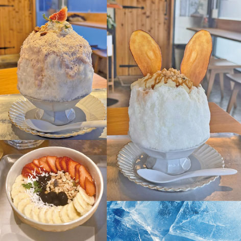 夏は終わりましたが、店内は絵本の世界で、かき氷は秋バージョンに変わります。純氷を薄く削りフワフワケーキのごとく、新メニュー「やきいもうさぎ、いちじくフォルマッジ」も登場!地元の生フルーツを使った旬の味覚も最高!季節感が味わえるフワフワかき氷をぜひどうぞ。