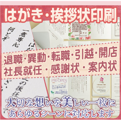 TOP 加盟店情報 川口順克堂 加盟店情報 川口順克堂 退職・転勤・異動や法人化の挨拶状など、はがき印刷は専門店にお任せ! 色彩も文字も鮮明で上質な仕上がり。短納期・少部数にも柔軟に対応し、想いが伝わる一枚を作ってもらえるお店。気軽に利用してみよう。 店舗情報 住所 宇部市寿町2丁目12-16 電話 0836-21-2341 営業時間 平日9:00~18:00 土9:00~17:00 定休日 日、祝祭日 駐車場 あり 特典 精算前のカード提出で 印鑑20%OFF (ゴム印・奉仕品は除く) アクセスマップ